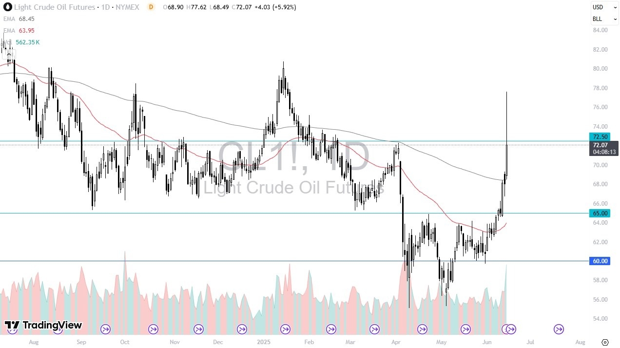 In fact, after this was announced, the market gained about $5 in just a single hour. We continued to go higher, gaining another roughly $4 and have cents pulled back. That’s not a huge surprise because sooner or later you run out of people willing to sell unless they’re collecting profit. The $72.50 level is an area that previously has been both support and resistance, most recently resistance, and the fact that we are closing below there does suggest that we need a pullback.