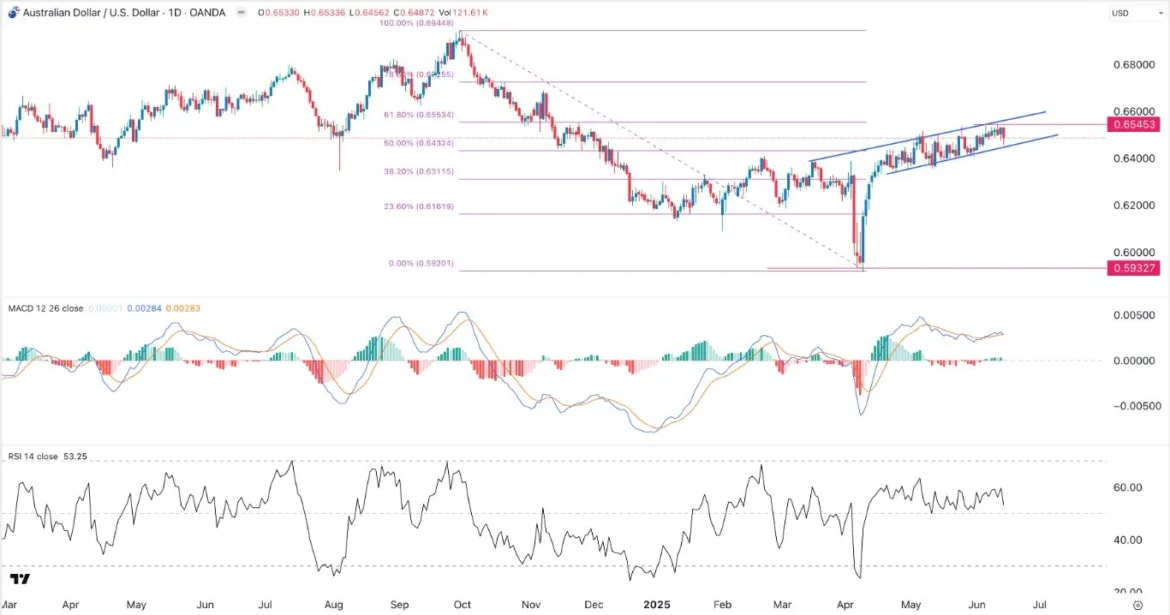 The daily chart shows that the AUD/USD exchange rate has been in an uptrend in the past few weeks. It has moved from a low of 0.5932 in April to a high of 0.6545, its highest swing since November last year.
