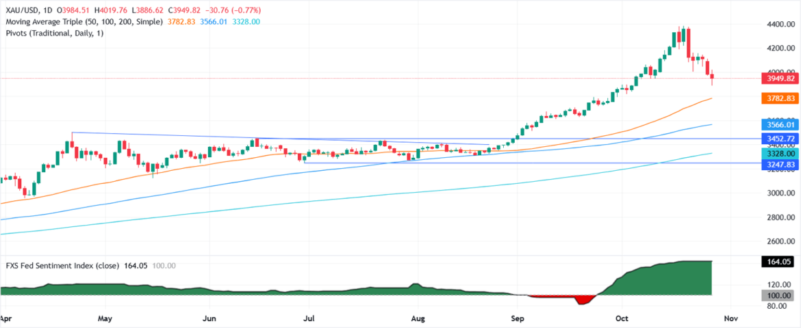 Gold’s broader uptrend stays intact despite the dip below $3,900, which pushed prices toward $3,886, a three-week low. The Relative Strength Index (RSI) continued to tilt lower, signaling that sellers are gaining momentum, and it turned bearish.